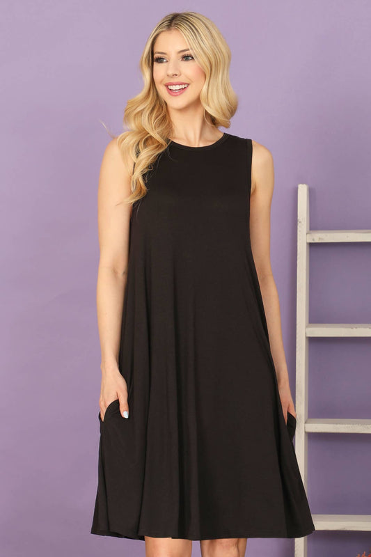 D3252- SLEEVELESS SOLID SIDE POCKET DRESS