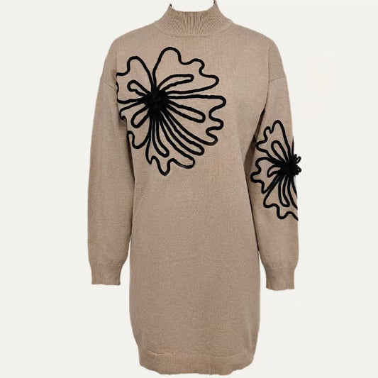 Cute Khaki Flower Mock Neck Long Sleeve Knit Dress