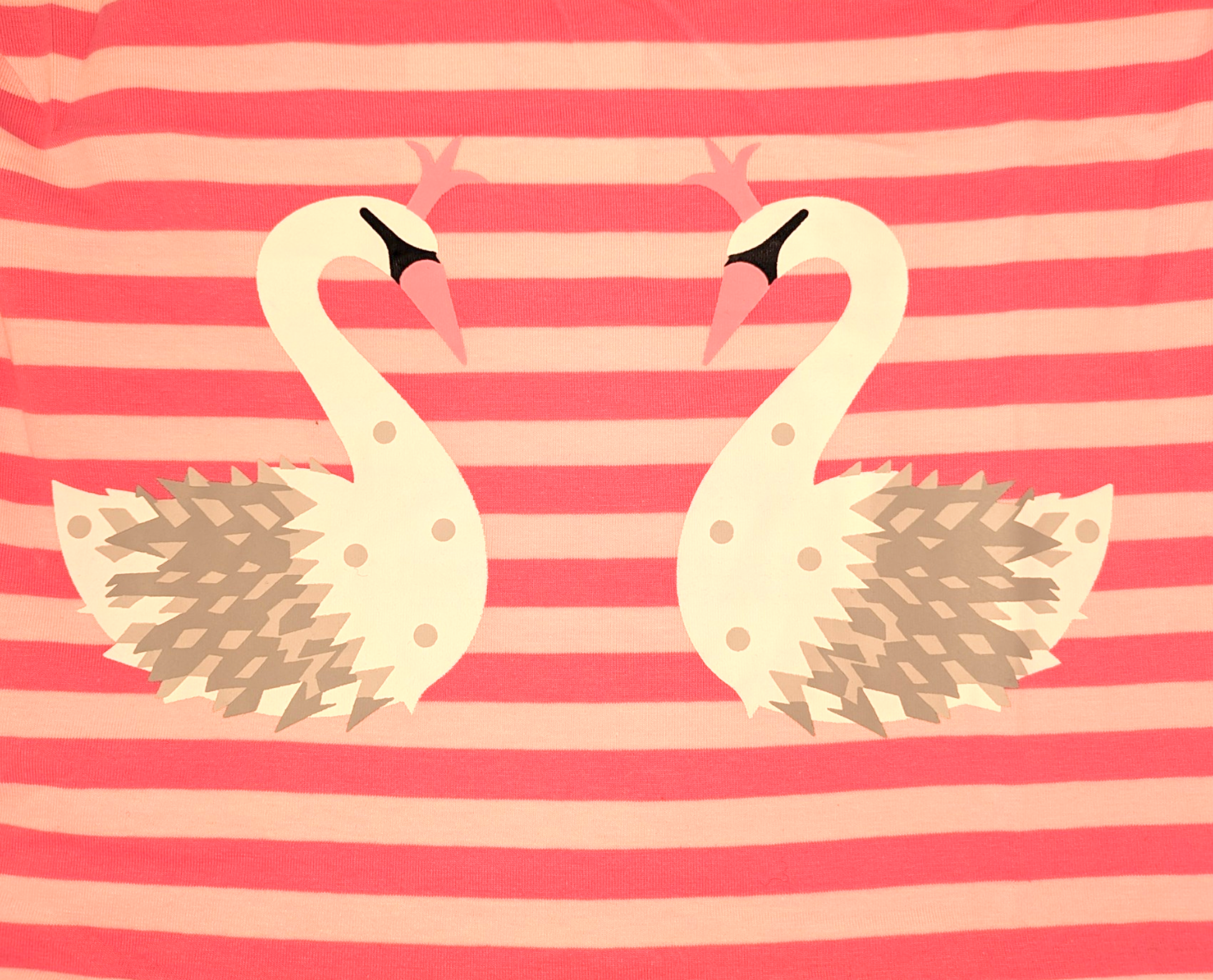 Tunic: A sleeveless tunic adorned with playful pink and white stripes. The front showcases two elegant swans wearing crowns, adding a touch of whimsical charm. The tunic features a blue polka dot ruffle collar.