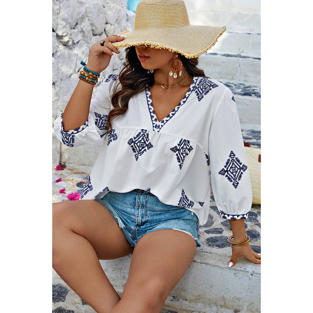 Plus Size Deep V Printed Loose Elastic Sleeve Top