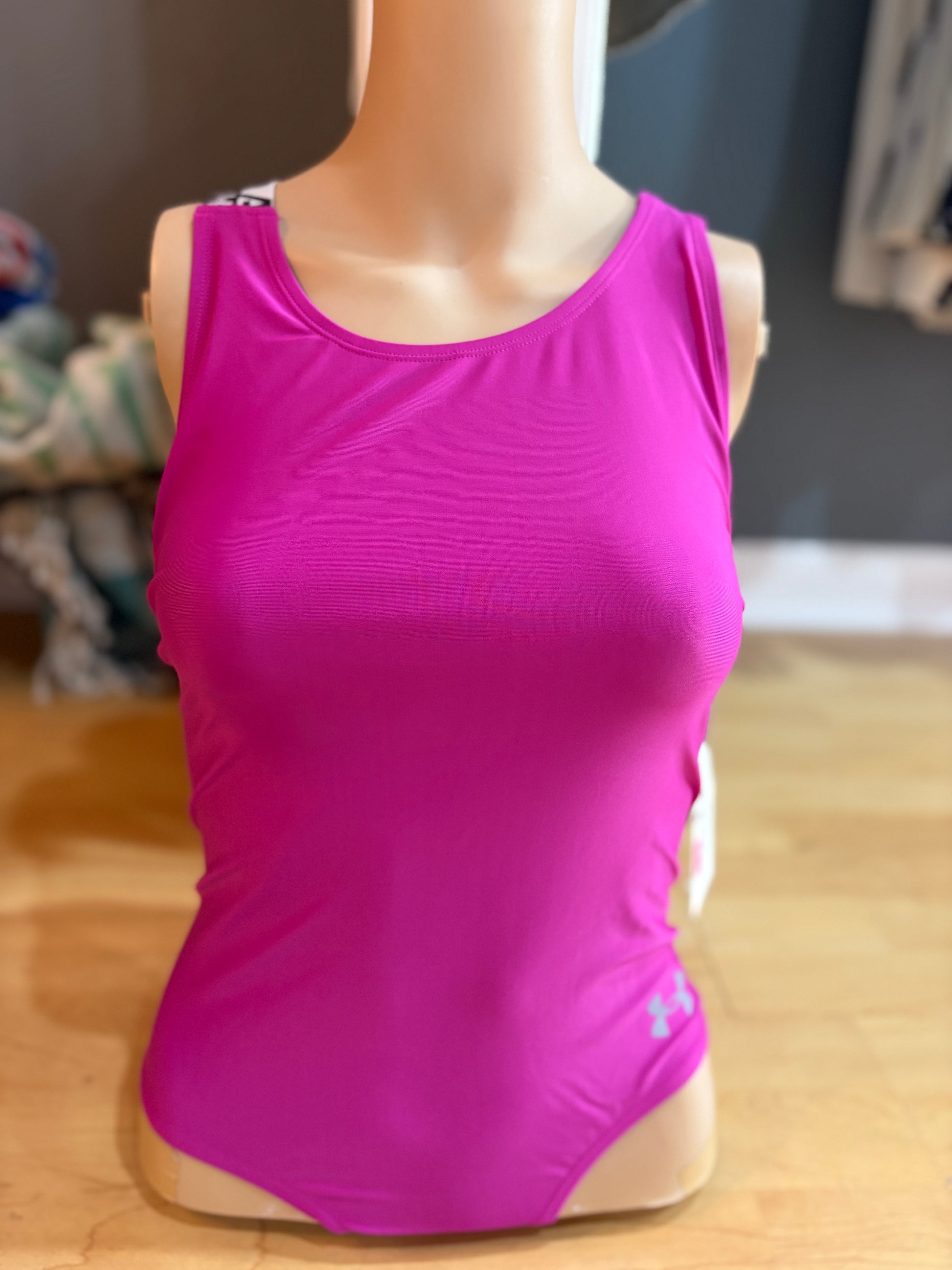 This Under Armour girls swimsuit features a racer back design, providing comfortable support for active movements in and out of the water. Made with a durable material, this swimsuit is ideal for young swimmers and ensures lasting wear. Stay stylish and confident while swimming in this Under Armour bathing suit.