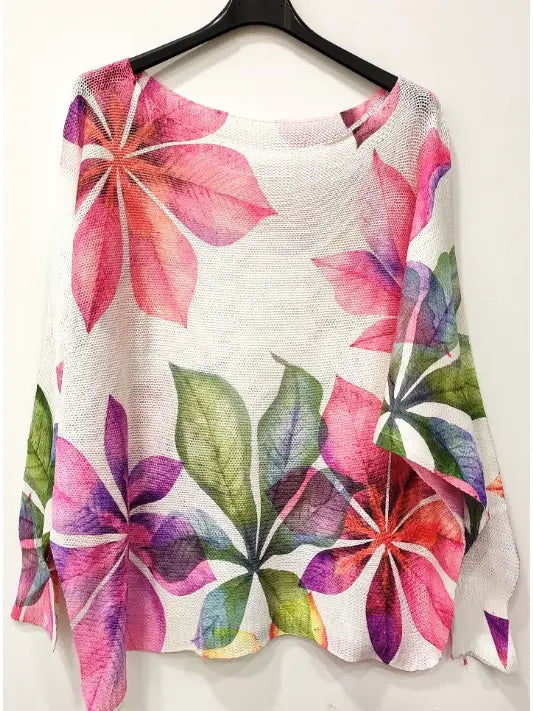 This imported Italian White Leaves floral Pink green Round Knit Printed Sweater adds a touch of natural beauty to any outfit. The intricate floral design and vibrant colors create a unique and stylish look. Made from high-quality knit fabric, it offers both comfort and durability.